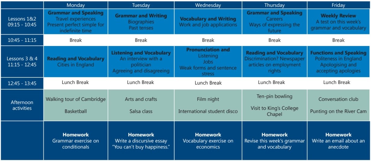 Il corso di Inglese Generale EFL-20 prevede lezioni di mattina con grammatica, esercizi di conversazione e pronuncia, scrittura, ascolto e comprensione del testo. Il primo giorno del corso gli studenti faranno un test scritto e orale volto alla valutazione della loro conoscenza dell’inglese. Gli studenti svolgeranno i test alla fine di ogni settimana e alla fine del corso. Le lezioni includono l’utilizzo dei nuovi media, ad esempio esercizi di ascolto su Internet, video e notizie di attualità.