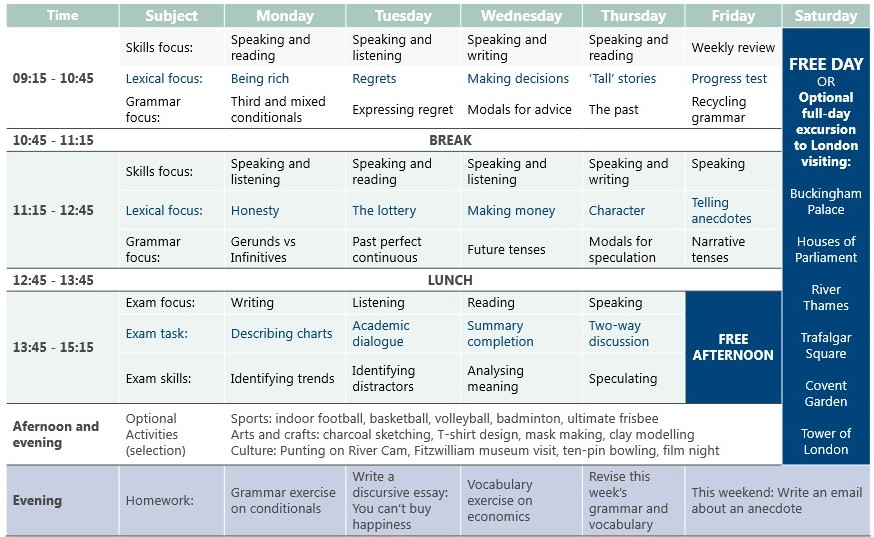 Il corso di inglese IELTS 28 è la preparazione ideale e efficace per l’esame IELTS. Tutte le lezioni sono concentrate esclusivamente sull’esame. Il corso è stato pianificato per assicurare che gli studenti raggiungano almeno il punteggio minimo per essere ammessi a un corso universitario in Inghilterra, ovvero 6.0. I costi dell’esame (circa £150) non sono inclusi nella tariffa del corso. I libri del corso costano circa £45 per ogni corso.