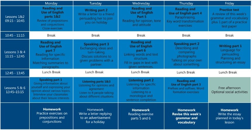 Un esempio di orario del corso di inglese per l’esame FCE 28: